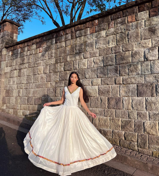 ROZINA WHITE GOWN WITH MULTICOLOR ETHIOPIAN DRESS | VIBRANT HABESHA KEMIS | HABESHA DRESS FOR EVENTS
