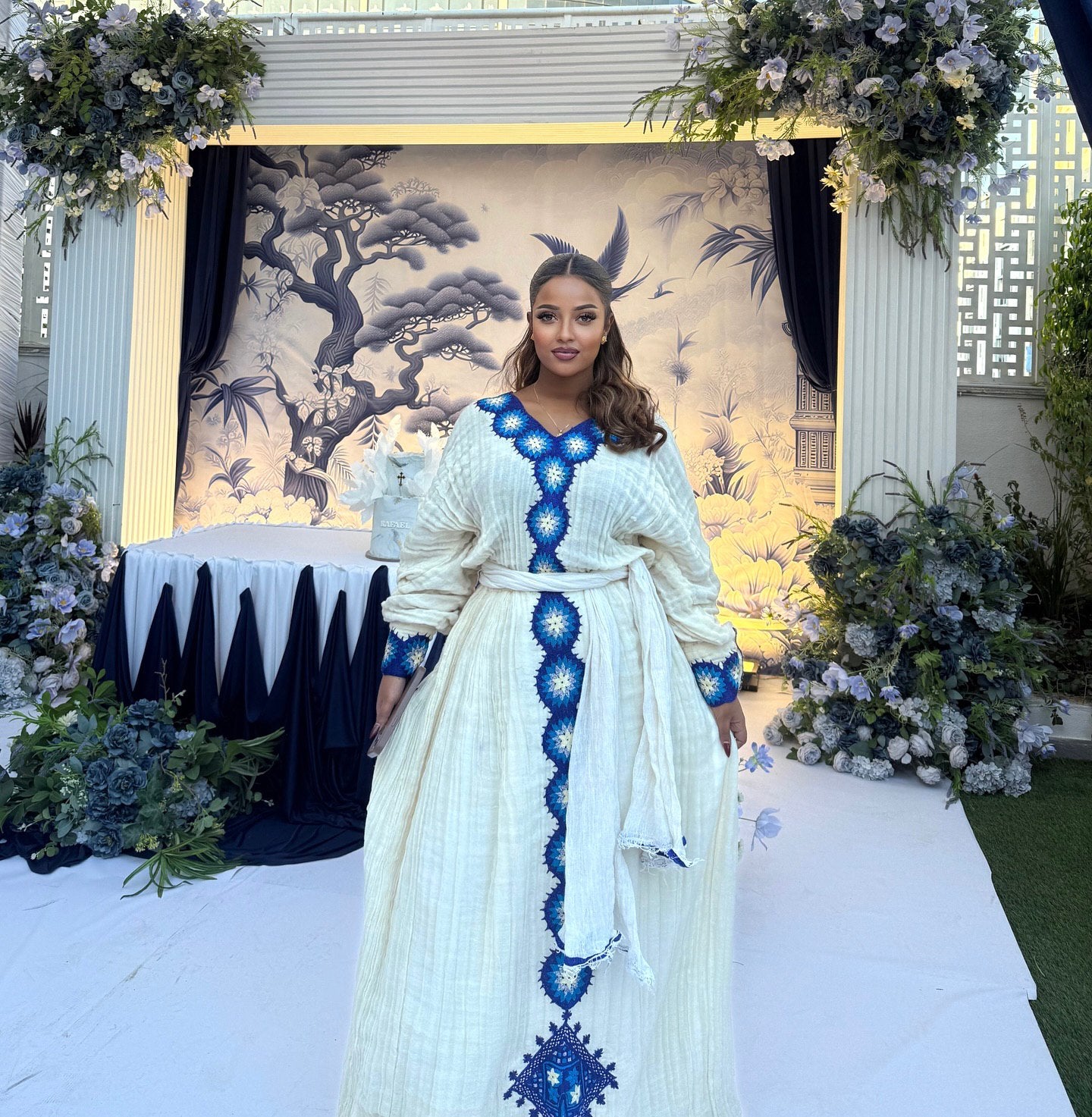 Command attention in this magnificent Habesha Kemis, a breathtaking piece of artistry and Eritrean Traditional Dress. The gown is fashioned from crisp, textured white fabric and showcases vibrant royal blue Tilet embroidery that creates a regal contrast. The distinct V-neckline is beautifully outlined, and the elaborate blue design extends down the center of the skirt and circles the cuffs, offering a striking, vertical line that is incredibly flattering. This specific Handwoven Cotton Garment is perfectly suited for formal cultural gatherings and significant life celebrations, such as weddings and baptisms.