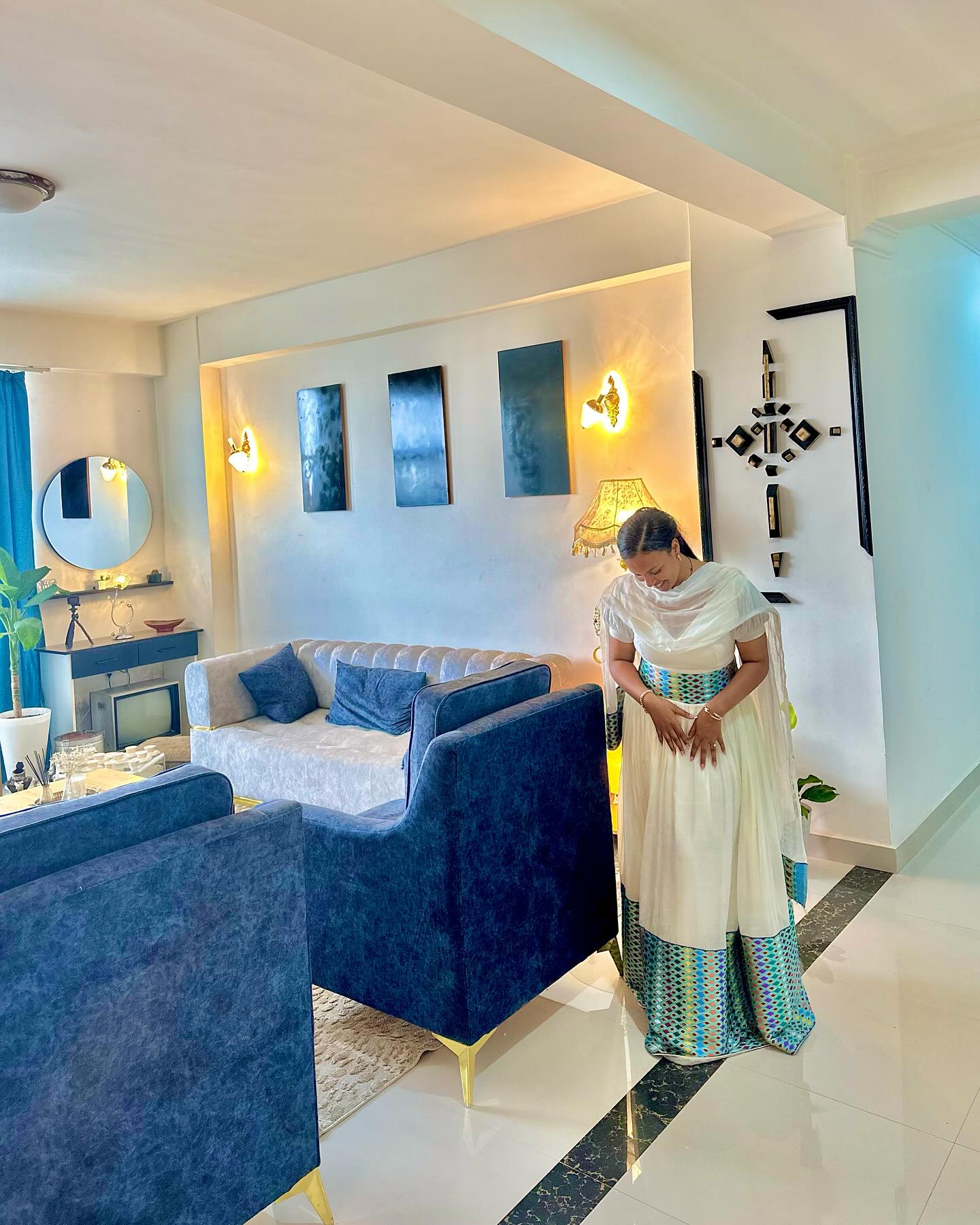 Rooted in heritage yet styled for today, this Ethiopian traditional dress blends comfort with refined elegance. The bright geometric accents reflect the rich diversity found across Ethiopian and Eritrean cultures, giving the design a lively identity. Whether worn casually or for ceremonial events, it radiates timeless sophistication.