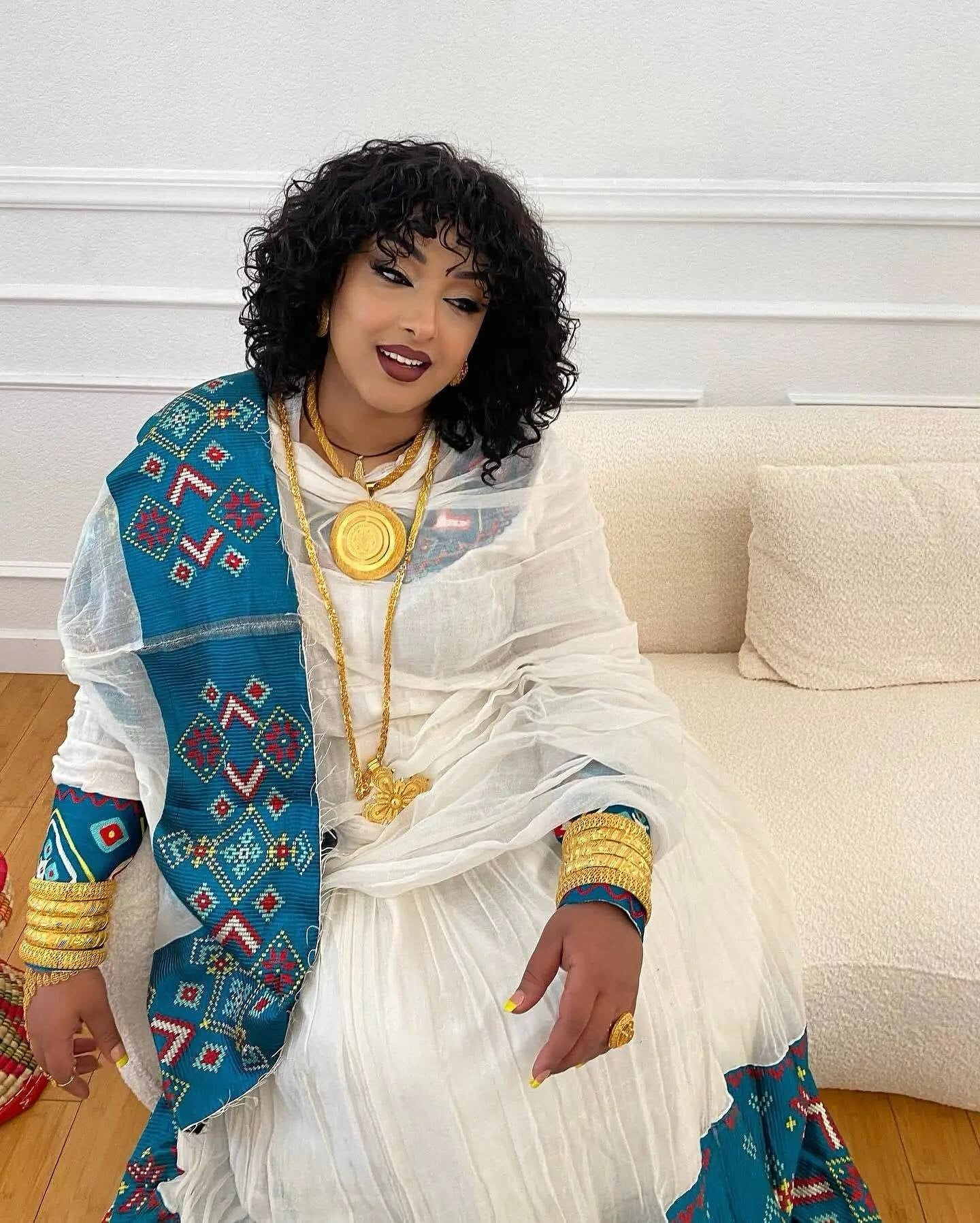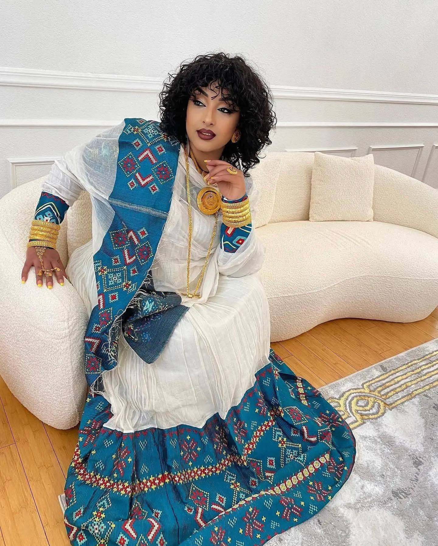 This stunning Ethiopian dress is a modern take on timeless tradition, featuring bold blue patterns and luxurious golden jewelry. Itās designed for the woman who values cultural expression and elegance.