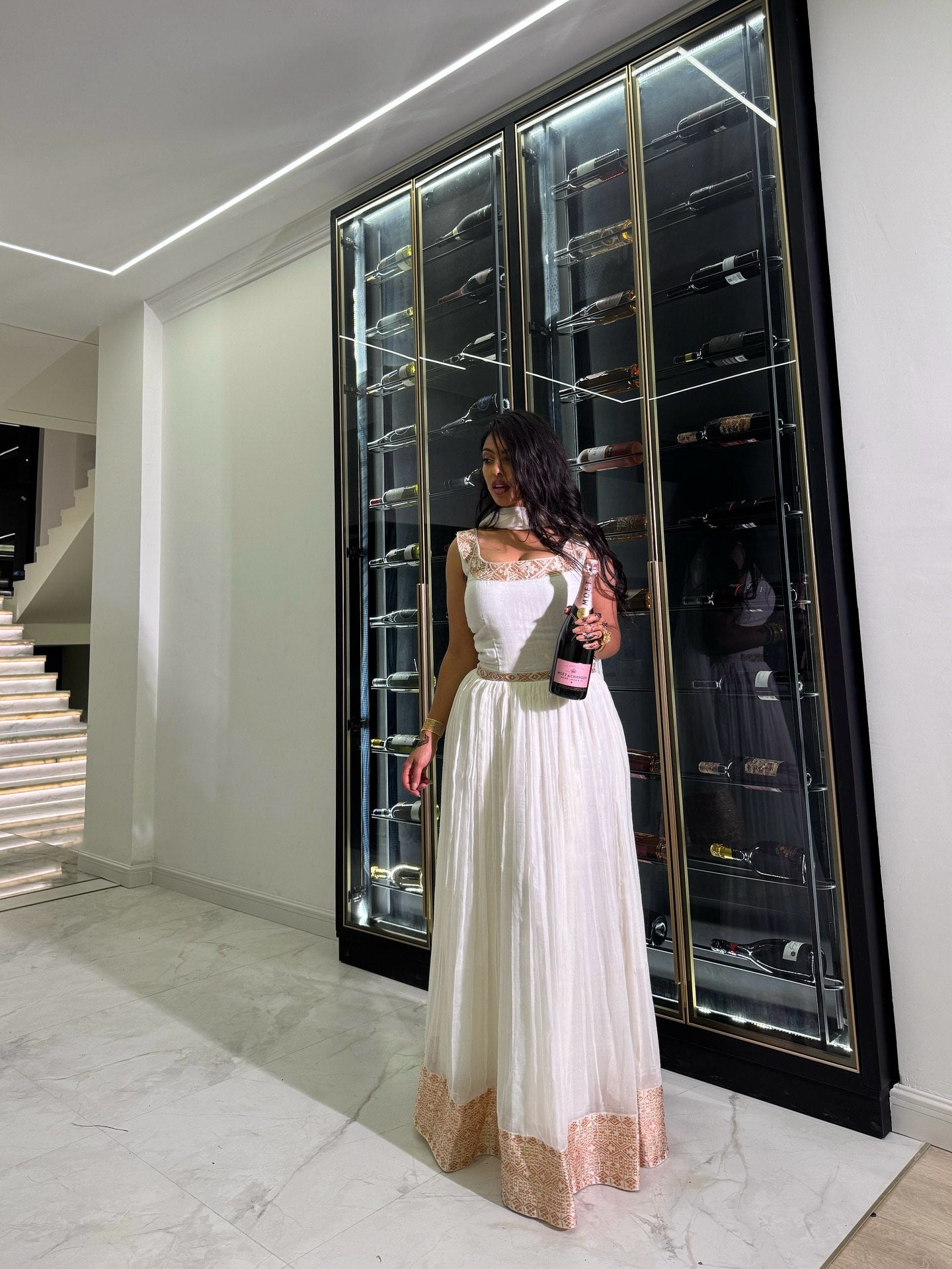This graceful gown is crafted from soft Habesha cloth, showcasing the beauty of cultural craftsmanship. The white fabric is elegantly decorated with peach embroidery along the neckline and hemline, adding a warm and delicate touch to the entire design. Its flowing skirt and sleeveless cut make it both comfortable and stylish.