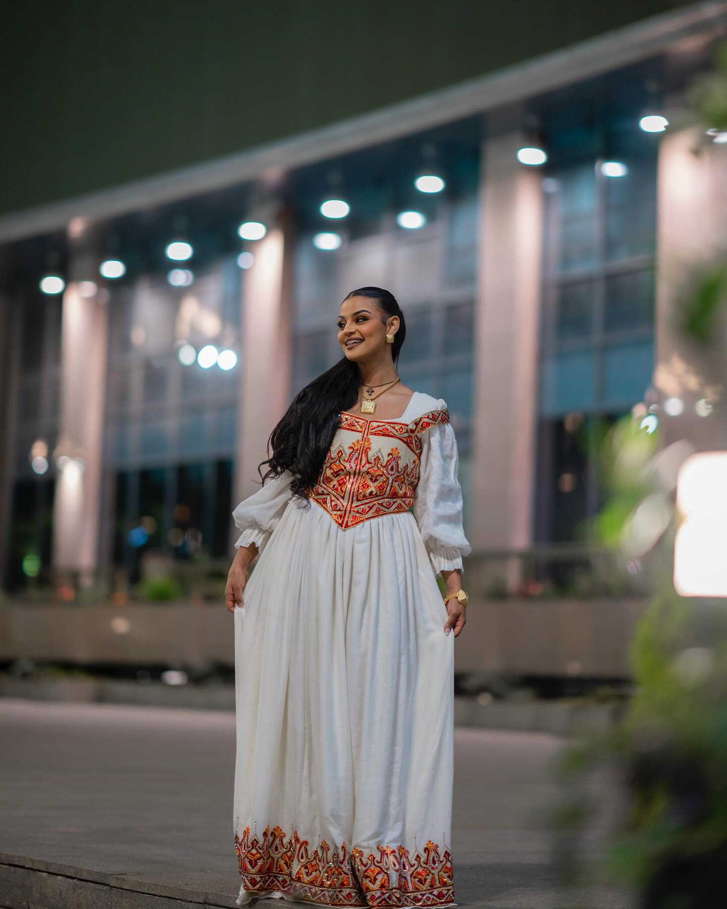 Made from soft, flowing fabric, the dress includes dramatic cape sleeves, a deep V neckline, and symmetrical geometric motifs inspired by heritage art. The embroidery on this traditional Ethiopian dress is handwoven with care, giving it a rich, regal look that makes it ideal for traditional ceremonies, engagement events, or reception moments. It stands as a modern evolution of traditional Ethiopian clothing, blending culture with couture.