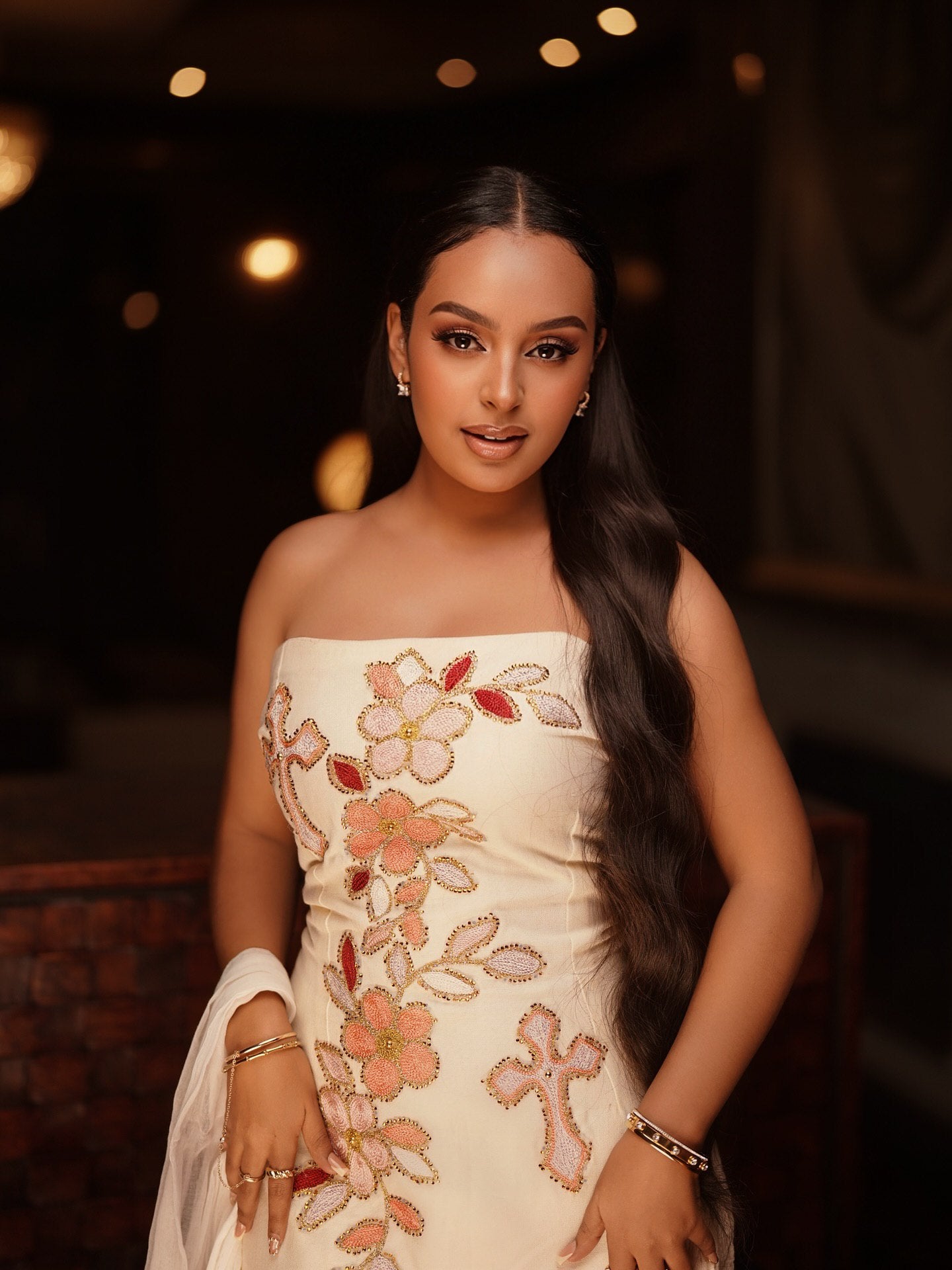This luxurious Ethiopian traditional dress is a flawless example of how modern elegance can enhance the beauty of cultural attire. The gown features a flowing white skirt with elaborate embroidery in gold, sage green, and soft blue hues. The design is a refined version of the habesha kemis, tailored to highlight both tradition and sophistication. The strapless style adds a regal, contemporary finish.