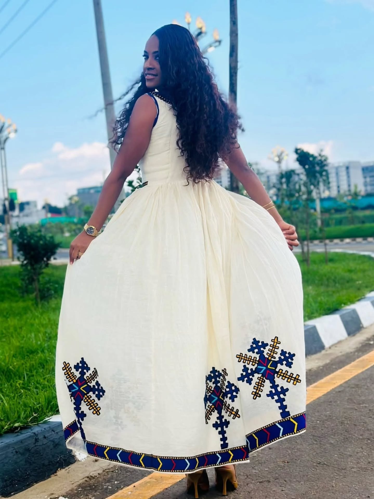 The sophisticated blend of modern design with deep cultural roots makes this dress a remarkable representation of both Eritrean dress and Ethiopian attire. The fabric, likely high-quality, hand-spun cotton, ensures a comfortable yet luxurious feel, maintaining the integrity of Traditional Ethiopian clothing. It is perfect for engagements, weddings, holidays, or any event where you wish to celebrate culture with unmatched elegance.