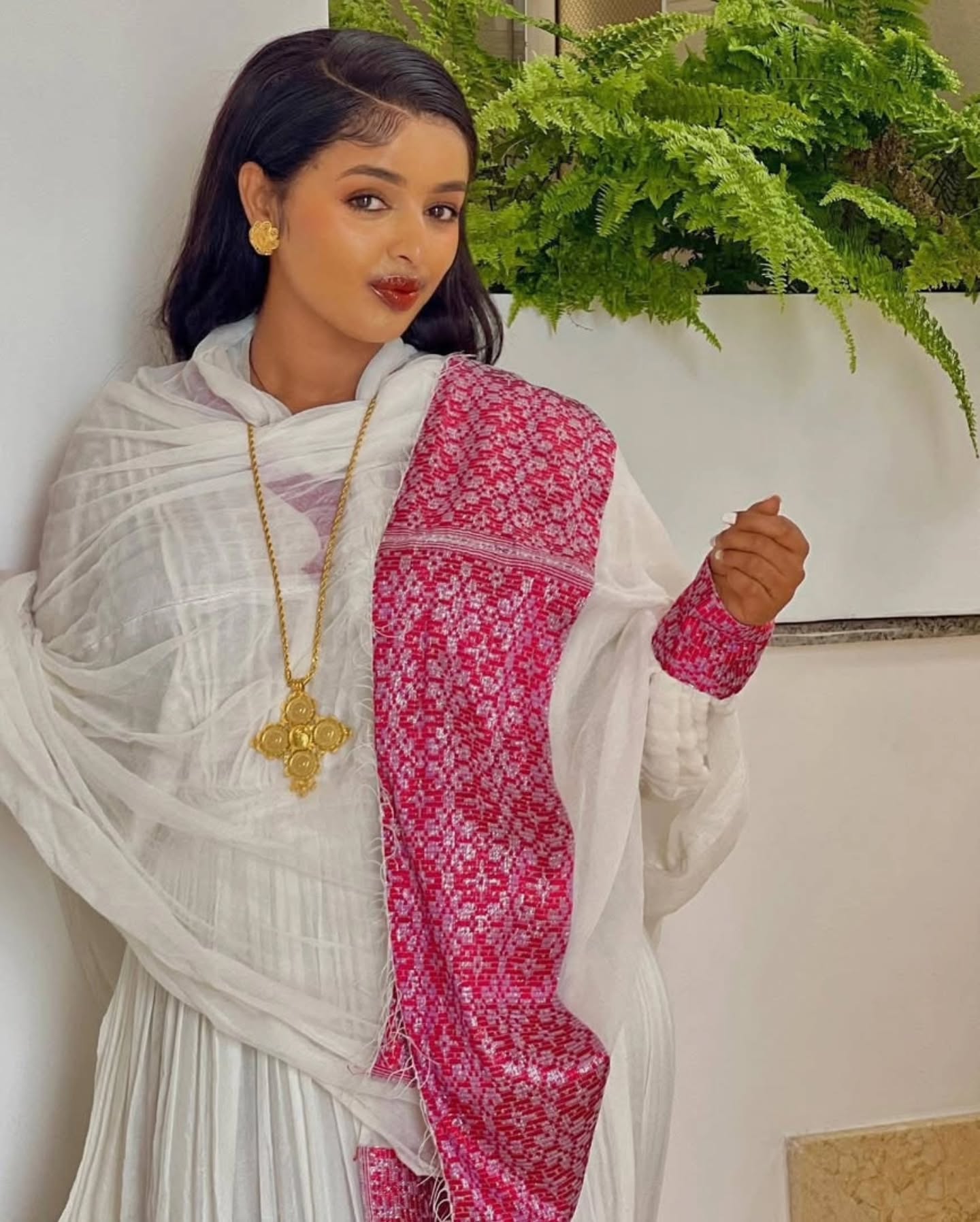 The shawl drapes naturally around the shoulders, enhancing presence and posture, while golden jewelry completes the look with subtle sophistication. Whether worn for family gatherings, weddings, or formal celebrations, the dress honors heritage while offering a fresh, modern expression of Traditional Ethiopian clothing aesthetics.